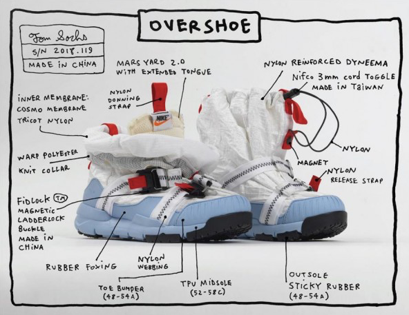 This week, the artist Tom Sachs unveils his latest sculpture: the Nike Mars Yard Overshoe. It is an artefact that conveys the corporeal values of Sach’s sport of making and musing. ‘I take the sock-liners out of my sneakers so that the ground is harder below so I can think clearer. I like to feel my skeletal structure because it’s within all of us’. Sneaker-heads rushing to get a pair at Dover Street Market in London are dedicated to keeping their kicks clean.