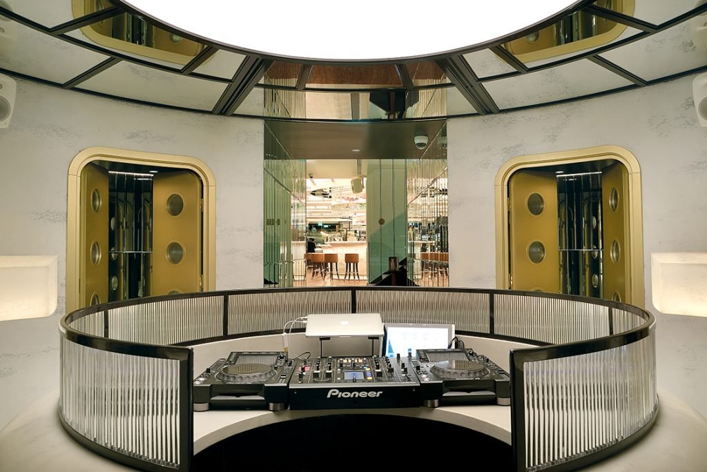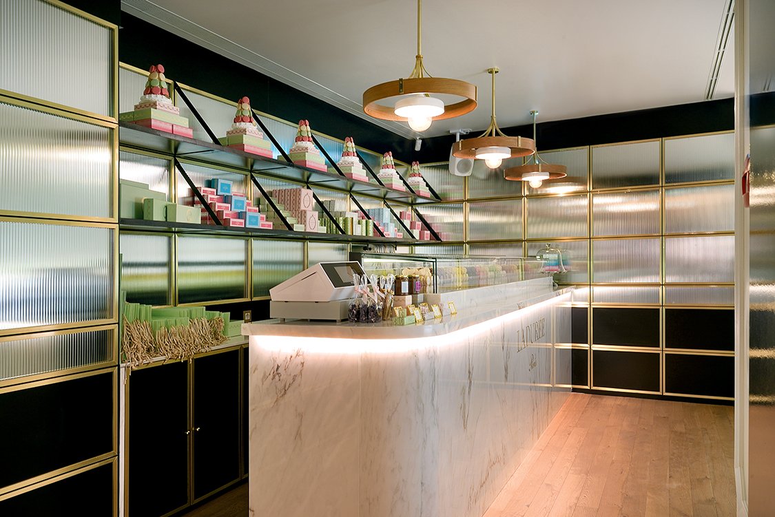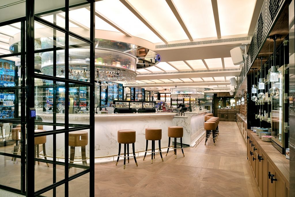 The second level features the 42-seat Jncquoi Delibar, a more casual dining space anchored by a boutique grocery filled with fine cheeses, charcuterie, and gourmet goods. Here, the wine-tasting room, Assouline library, and Ladurée bakery are clustered, creating a floor that feels both social and indulgent.