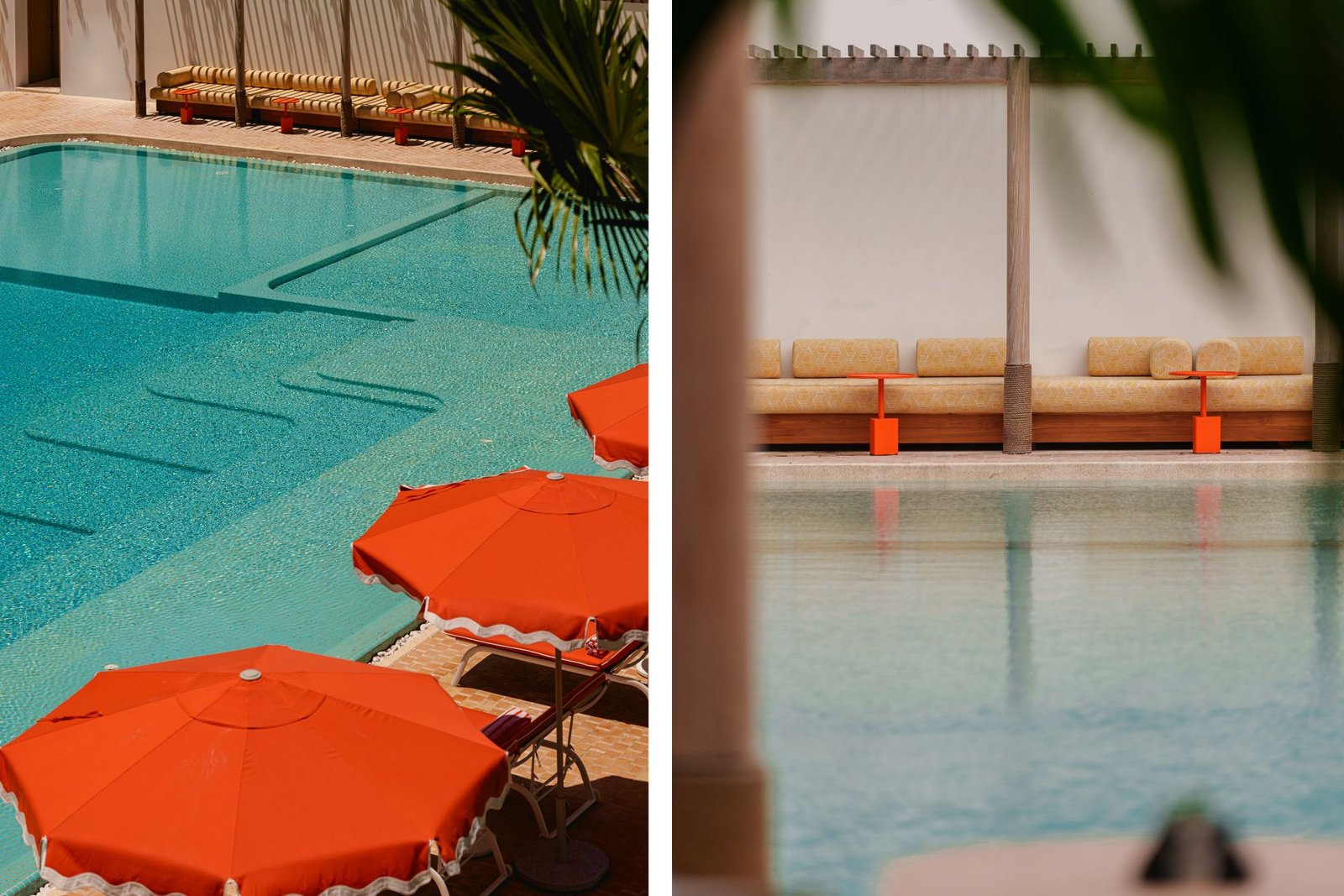 The main pool is quintessential Standard—striped loungers, bougainvillea-heavy pergolas, and an atmosphere that feels effortlessly cosmopolitan.