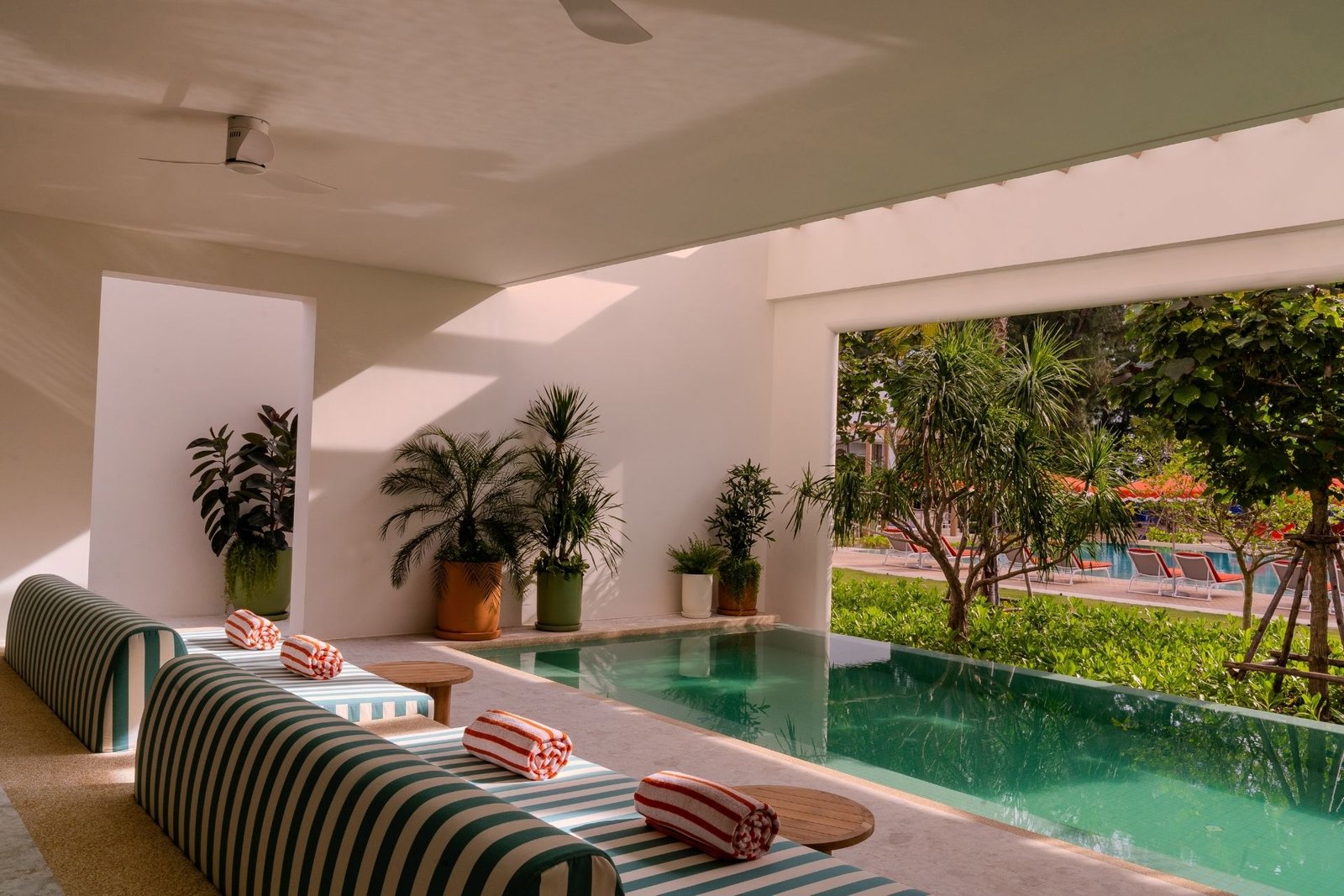 A sleek bar anchors the space, while mosaics and sculptural walls lend a subtle theatricality. Here guests move between a mud lounge, an ice bath, a hidden pool, and an easygoing all-day menu that spans indulgent burgers to Isaan-inspired comfort plates. By sunset, Mmhmmm becomes the resort’s pulse—a discreet, grown-up orbit of conversation, music, and shared discovery.