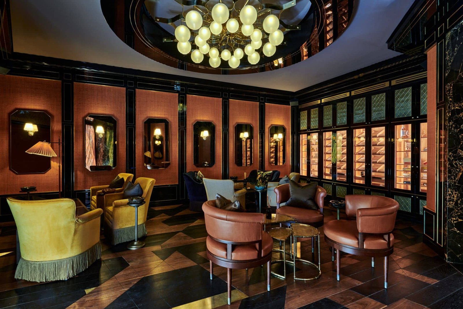 Upstairs, the Italian restaurant offers something different again: a lighter, more playful setting that pairs generous cooking with nostalgic music and an atmosphere that leans gently toward celebration. Together, the dining spaces form the social backbone of the club. Throughout the building, seven cocktail bars provide quieter corners for conversation — each with its own identity. Some feel like classic hotel bars: polished, discreet and perfect for a late-night discussion. Others hum with energy.